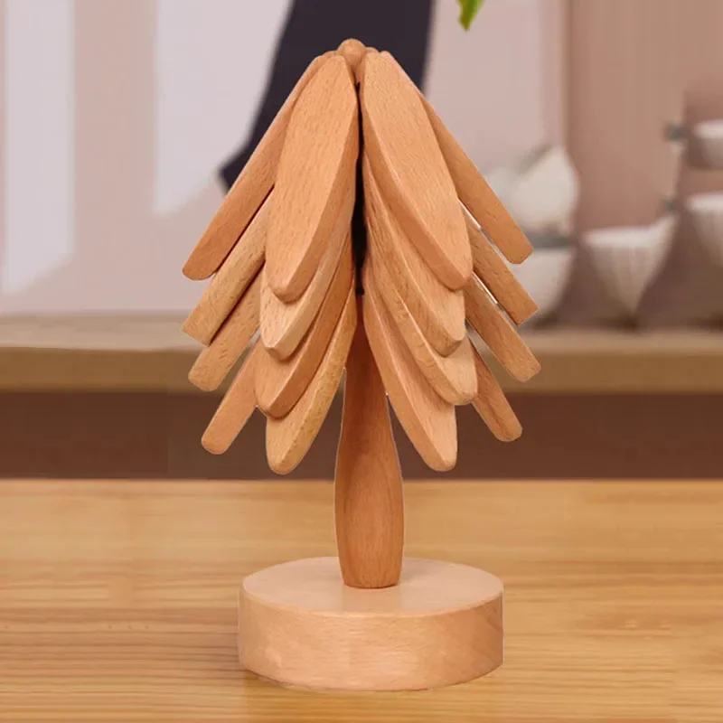 1. Descanso de madeira resistente ao calor. Este conjunto é produzido de madeira de alta qualidade e desenhos em forma de árvore, oferecendo um prático e decorativo acessório. Não só efetivamente isola contra altas temperaturas, protegendo a superfície da mesa de queimaduras, mas também serve como uma decoração única, adicionando uma atmosfera acolhedora à casa.